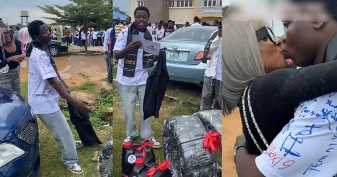 The lady went the extra mile to surprise her boyfriend with two car tyres and two kegs of fuel, leaving other students in awe. When he saw the surprise gifts she brought to celebrate him, he was unable to remain composed.