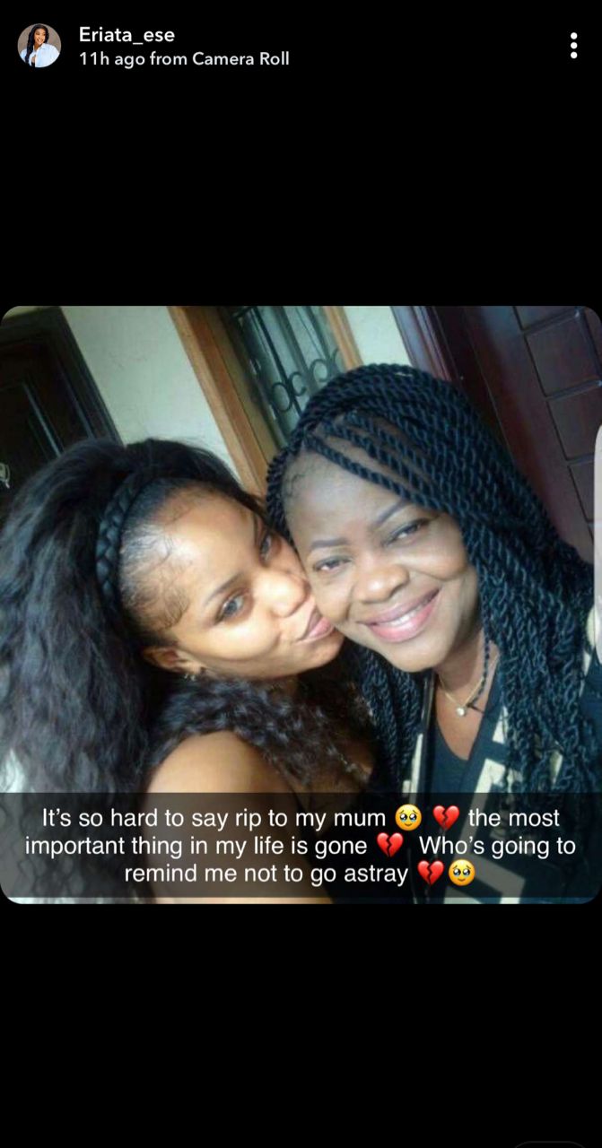 Ese Eriata broke the news of her mother’s death on her Snapchat profile amidst a lot of tears and regret.