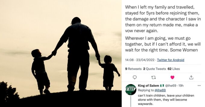 Wherever I am going, we must go together, but if I can’t afford it, we will wait for the right time. Some Women can’t train children, leave your children alone with them, they will become waywards.