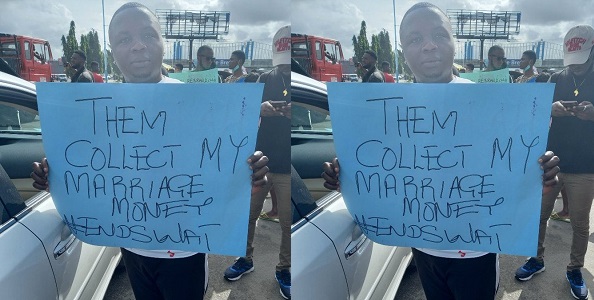 He was seen holding a placard with an inscription boldly written on it and, it read: “THEM COLLECT MY MARRIAGE MONEY #ENDSWAT.”