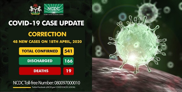 Therefore, as at April 18 2020, there are 541 confirmed cases, 166 discharged and 19 deaths.