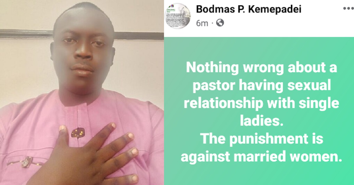 A Special Assistant to Bayelsa State Governor Douye Diri on New Media, Bodmas Kemepadei, has opined that there is nothing wrong with pastors sleeping with single ladies.