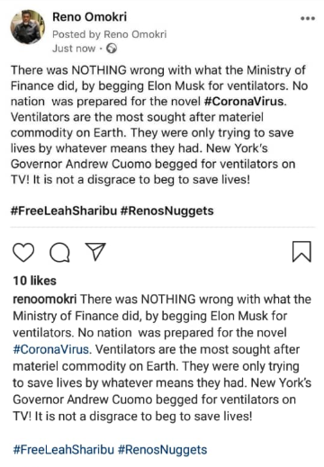 Reacting to it, he wrote: “There was NOTHING wrong with what the Ministry of Finance did, by begging Elon Musk for ventilators. No nation was prepared for the novel #CoronaVirus. Ventilators are the most sought after materiel commodity on Earth. They were only trying to save lives by whatever means they had. New York’s Governor Andrew Cuomo begged for ventilators on TV! It is not a disgrace to beg to save lives!”