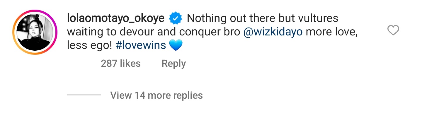 Lola Okoye, Peter Okoye’s wife, also reacted to Wizkid’s post, telling the singer, who hinted at looking for love, that there’s nothing outside but vultures waiting to devour.