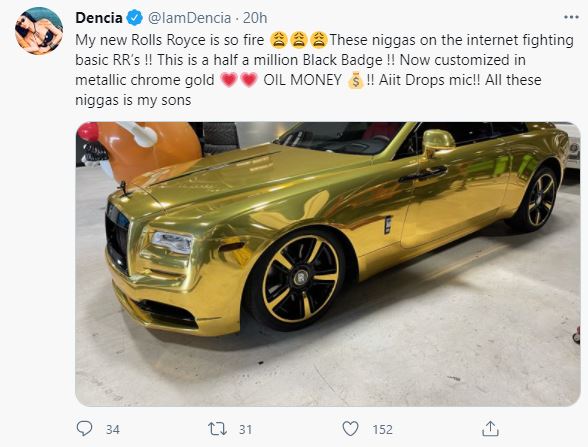 “My new Rolls Royce is so fire these niggas on the internet fighting basic RR’s !! This is a half a million Black Badge !! Now customized in metallic chrome gold heart OIL MONEY Money bag!! Aiit Drops mic!! All these niggas is my sons”
