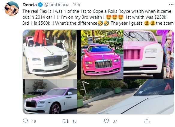 “The real Flex is I was 1 of the 1st to Cope a Rolls Royce wraith when it came out in 2014 car 1 !! I’m on my 3rd wraith ! Star-struckStar-struckStar-struck 1st wraith was $250k 3rd 1 is $500k !! What’s the differenceThe year I guess”
