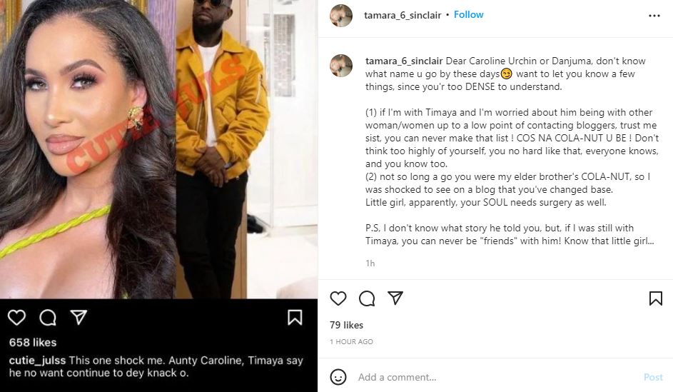Tamar has now fired back at her in a post she shared on her Instagram page. She stated that Caroline is not in the league of women that would make her contact a blogger over the singer. She also told her to stop thinking highly of herself because she is just a ‘colanut’.