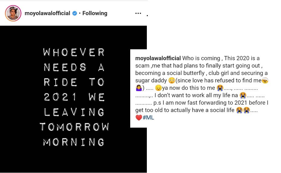 ”Who is coming , This 2020 is a scam ,me that had plans to finally start going out , becoming a social butterfly , club girl and securing a sugar daddy (since love has refused to find me洛路♀️) ….. ya now do this to me ….., …… ……… ………,.. I don’t want to work all my life na ….. …… ……….. p.s I am now fast forwarding to 2021 before I get too old to actually have a social life ….. ♥️#ML”