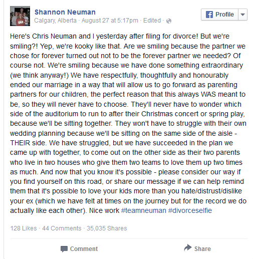 Chris and Shannon Neuman, who live in Calgary, Alberta, in Canada, took the memorable picture of themselves outside the Court of Queen’s Bench of Alberta after their divorce was finalised and shared it online.