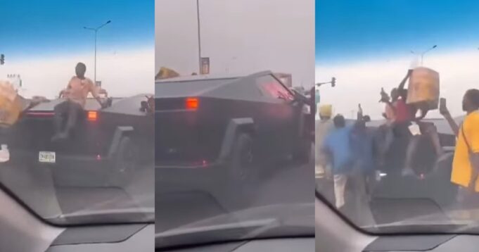 A trending video of Lagos street hawkers gathering around a Tesla Cyber truck in traffic has sparked a flurry of reactions.