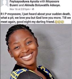 A lady has raised alarm following repeated posts about her faux death by a Facebook user, Feyisayooluwa Ayoola. The so-called Feyi, had first made a tribute post, seen above, on November 16th, the lady(who’s not dead) was notified of the post and made the post below.