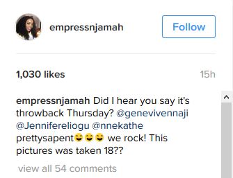 Actress Empress Njamah who at some point in her career, had a romance with controversial Nigerian singer, Timaya, thrilled her fans with a throwback photo of herself and top Nollywood star, Genevieve Nnaji with Jennifer Eliogu, Ndidi Obi during their humble days before the fame and affluence.