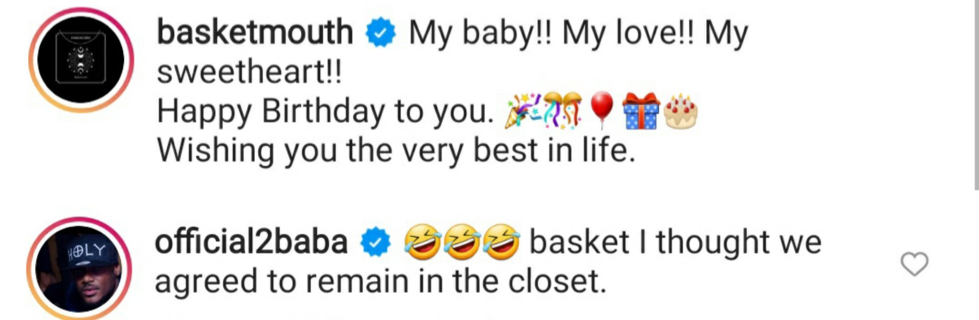 Basketmouth left a cheeky birthday message on his official Instagram page for 2Baba to which the latter responded. See their exchange,