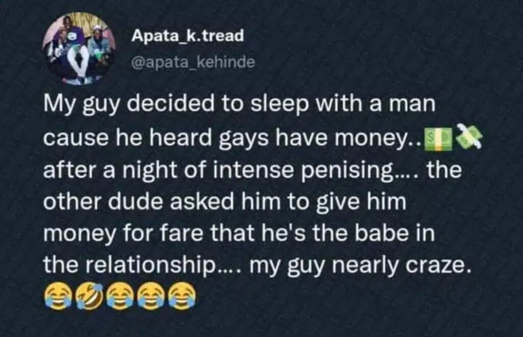 “My guy decided to sleep with a man cuz he heard gays have money. After a night of intense penising, the other dude asked him to give him money for fare that he’s the babe in the relationship. My guy nearly craze. 😂🤣😂😂😂.”