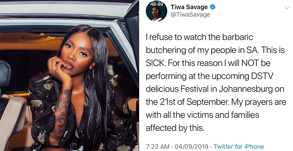 Tiwa Savage has canceled her appearance at the DSTV Delicious Festival in South Africa due to the xenophobic attacks on Nigerians.