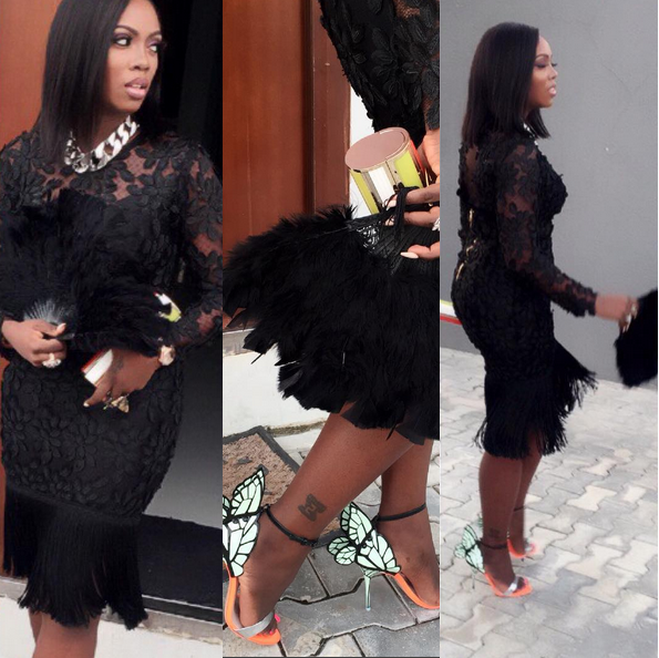 Either ways, whether or not she was wrong to have worn black to a wedding, fresh mama on the block, Tiwa Savage sure slayed in this black laced dress of hers as she rocked it to Ubi Franklin and Lilian Esoro‘s wedding over the weekend.