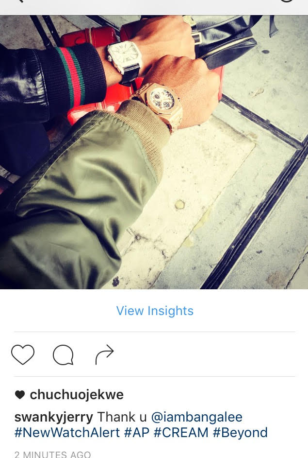 Celebrity stylist and fashion savvy personality, Jeremiah Ogbodo of Swanky’s signatures styling uploaded these photos of his new AP watch worth 45kUSD (20,250,000) which he claims was gifted to him by music mogul, Dbanj.