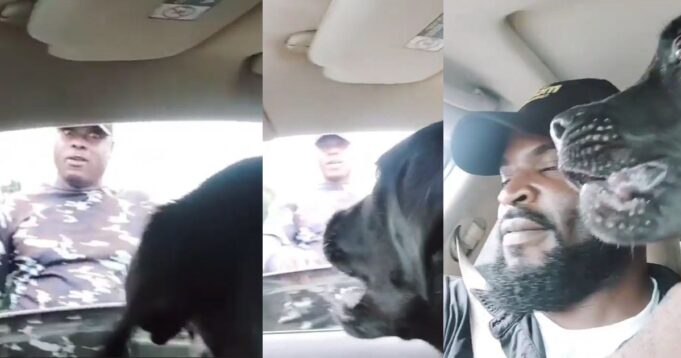 A video currently making the rounds online shows a police officer panicking and pleading after a motorist’s dog charged at him at a checkpoint.