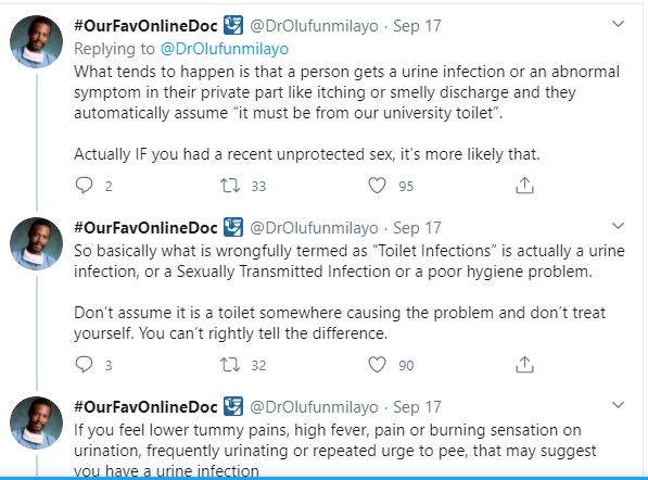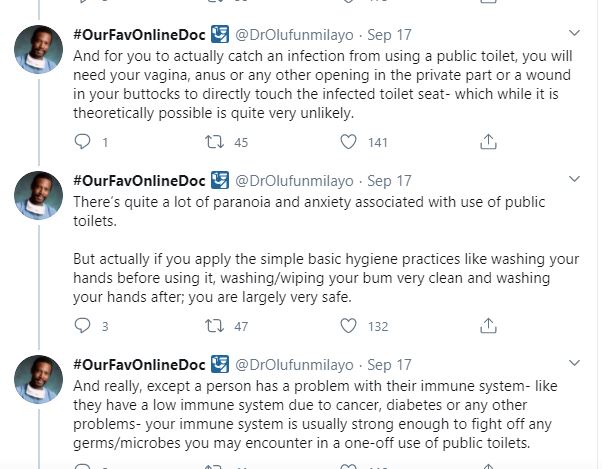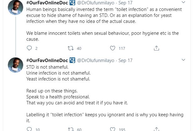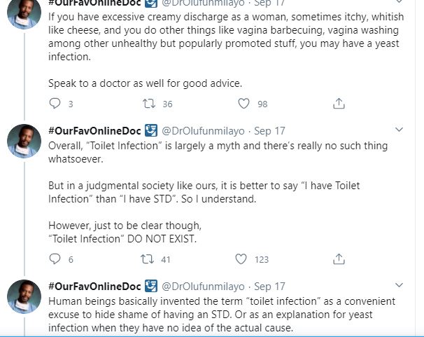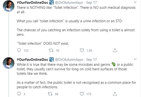 Popular Nigerian doctor and Twitter influencer, Dr Harvey Olufunmilayo has taken to the platform to enlighten users that toilet infection does not exist.