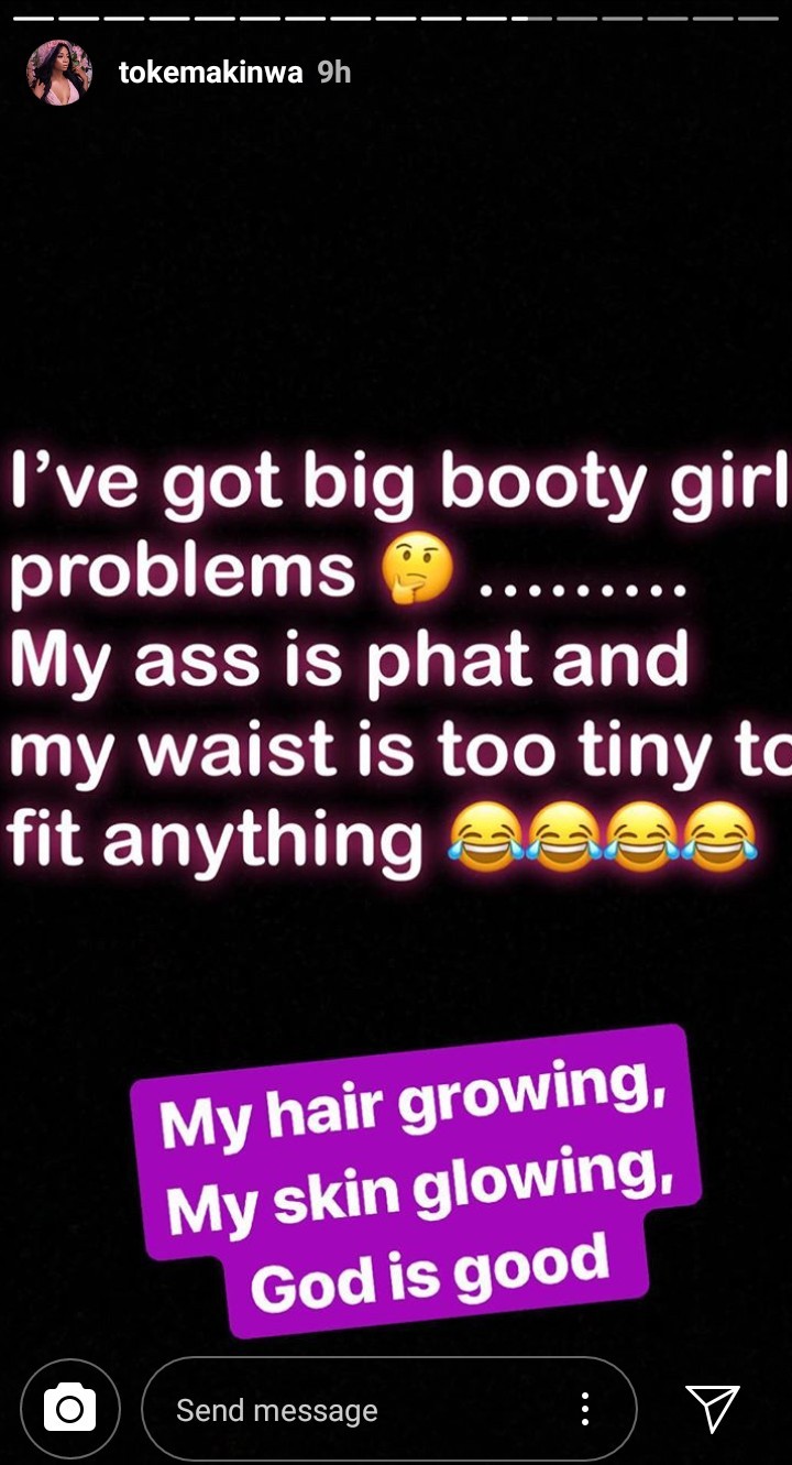Nigerian media personality, Toke Makinwa, who became curvaceous all of a sudden has began to acknowledge this recent change in her body as she says she’s having ‘problems’ with it.