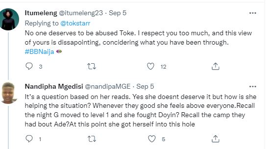 “Toke I will so drag you today. You stayed with an abuser for 13years. He fixed intro dates and never showed up embarrassing you and your family, treated you like you are nothing but you kept taking him back. You even married him. Woman, sit this out!!!”.