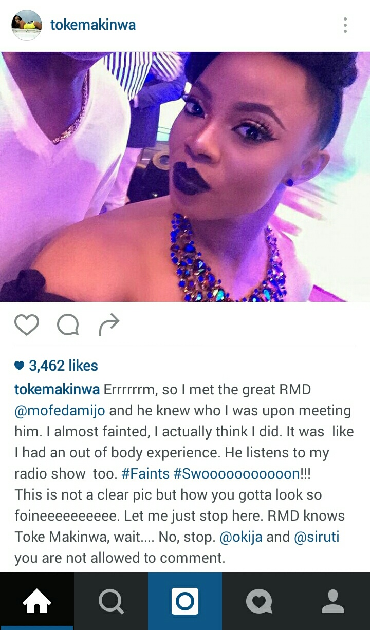 Yesterday,popular vlogger, Toke Makinwa shared a photo of herself and RMD at an African Magic event in Lagos, and the OAP couldn’t hold back from sharing her excitement.