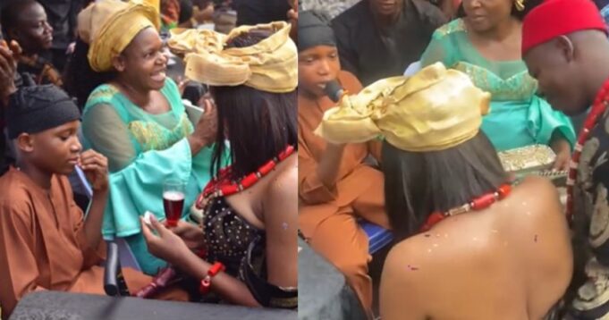 In the clip, the bride @Mhizdesire443 kneels before her younger brother for prayers while holding a glass of wine.