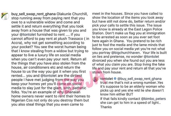 “Return all the things that you have stolen from the house, air conditioners etc and return the house to us the way you got it when you first rented… you and @tontolet are the dirtiest people I have met judging from the way you keep your homes yet you’ll come on social media to slay just for the glam, smh, pathetic folks.