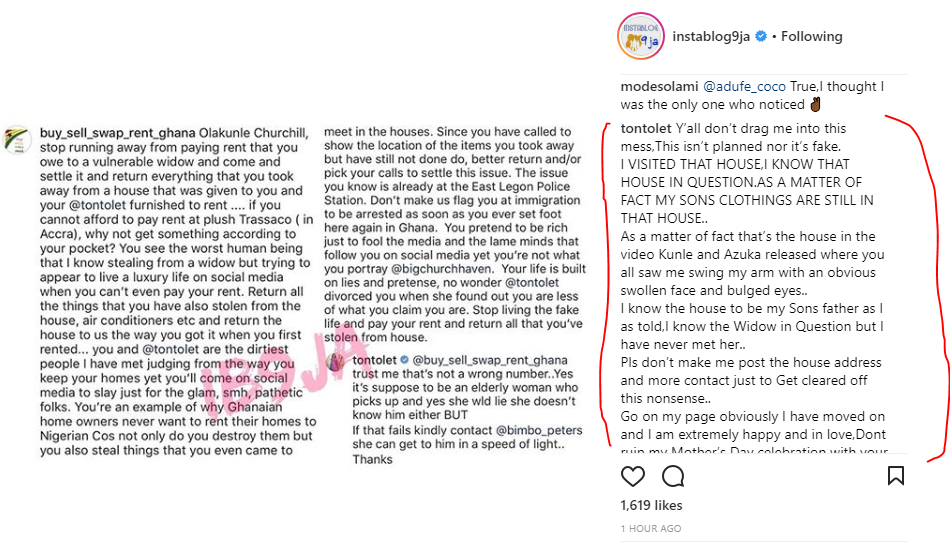”Olakunle Churchill, stop running away from paying rent that you owe to a vulnerable widow and come and settle it and return everything that you took away from the a house that was given to you and your @tontolet furnished to rent…