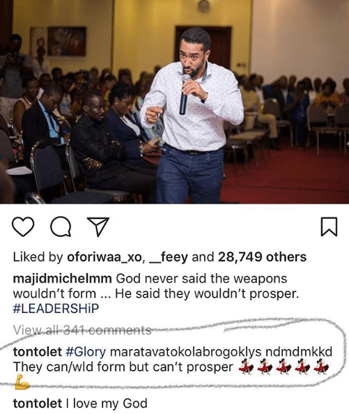 Tonto Dikeh suffered some backlash yesterday after she commented on a prayer post by Ghanaian actor and evangelist, Majid Michel.