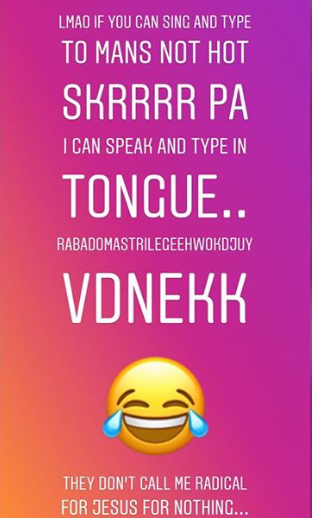 Reacting to this, Tonto Dikeh who claimed she is a radical for Jesus, said if people can sing the ‘skrrrr pa’ from the Man’s not hot single, she can also speak and type in tongues.