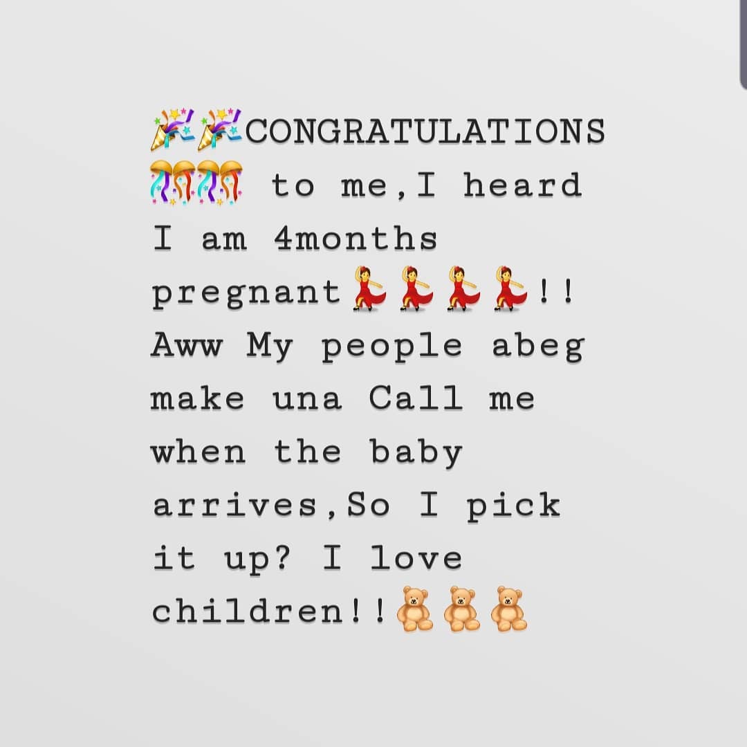 The actress sarcastically reacted to the report on her Instagram as she congratulated herself for being four months gone in her ‘pregnancy’. She then asks that she be given the baby when it arrives, so she can pick it up.
