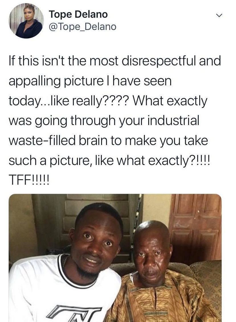 Nigerian writer, Tope Delano has taken to Twitter to slam actor, Jigan Baba Oja over a photo he took with veteran actor Baba Suwe.