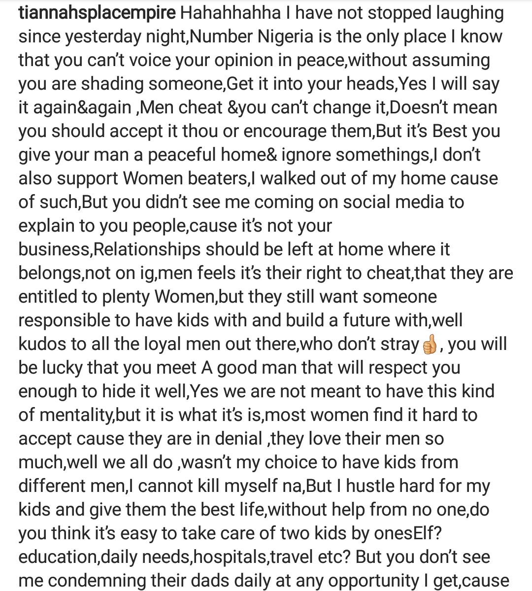 Toyin Lawani has reacted to the backlash which followed her Father’s Day Post in which she claimed all men cheat and are entitled to 10 women each.