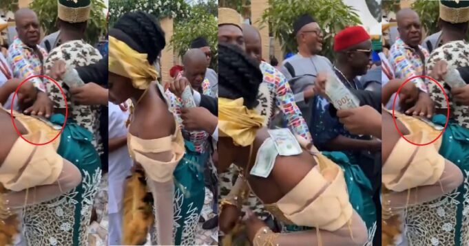 A video shared online captured the moment a wedding guest stylishly retrieved a $100 bill a bride was being sprayed.