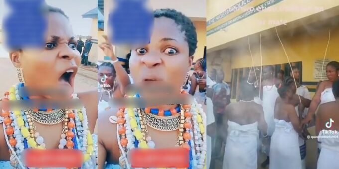 A video clip making the rounds online shows the moment the traditional worshippers who were clad in all-white attire invaded the police station with long canes.
