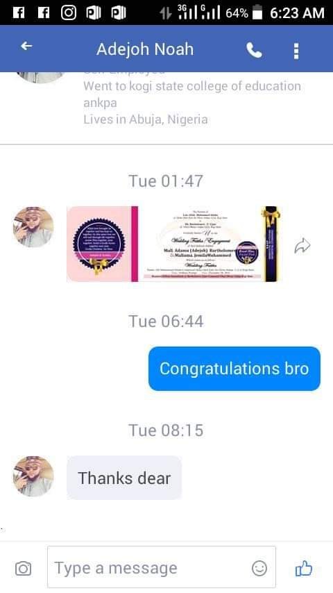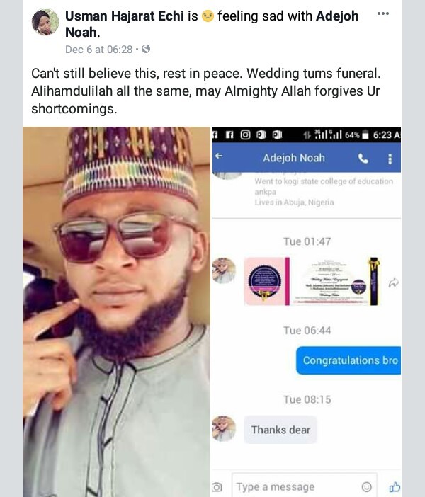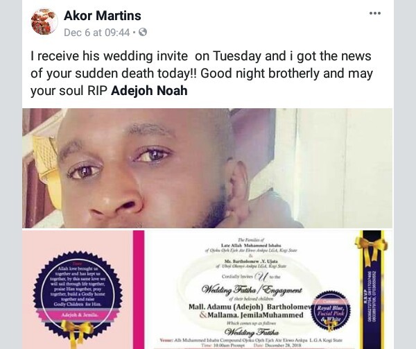 A young Nigerian man identified as Adejoh Noah, tragically passed away on the 6th of December, 2018 a day after sending out his wedding invites to friends.