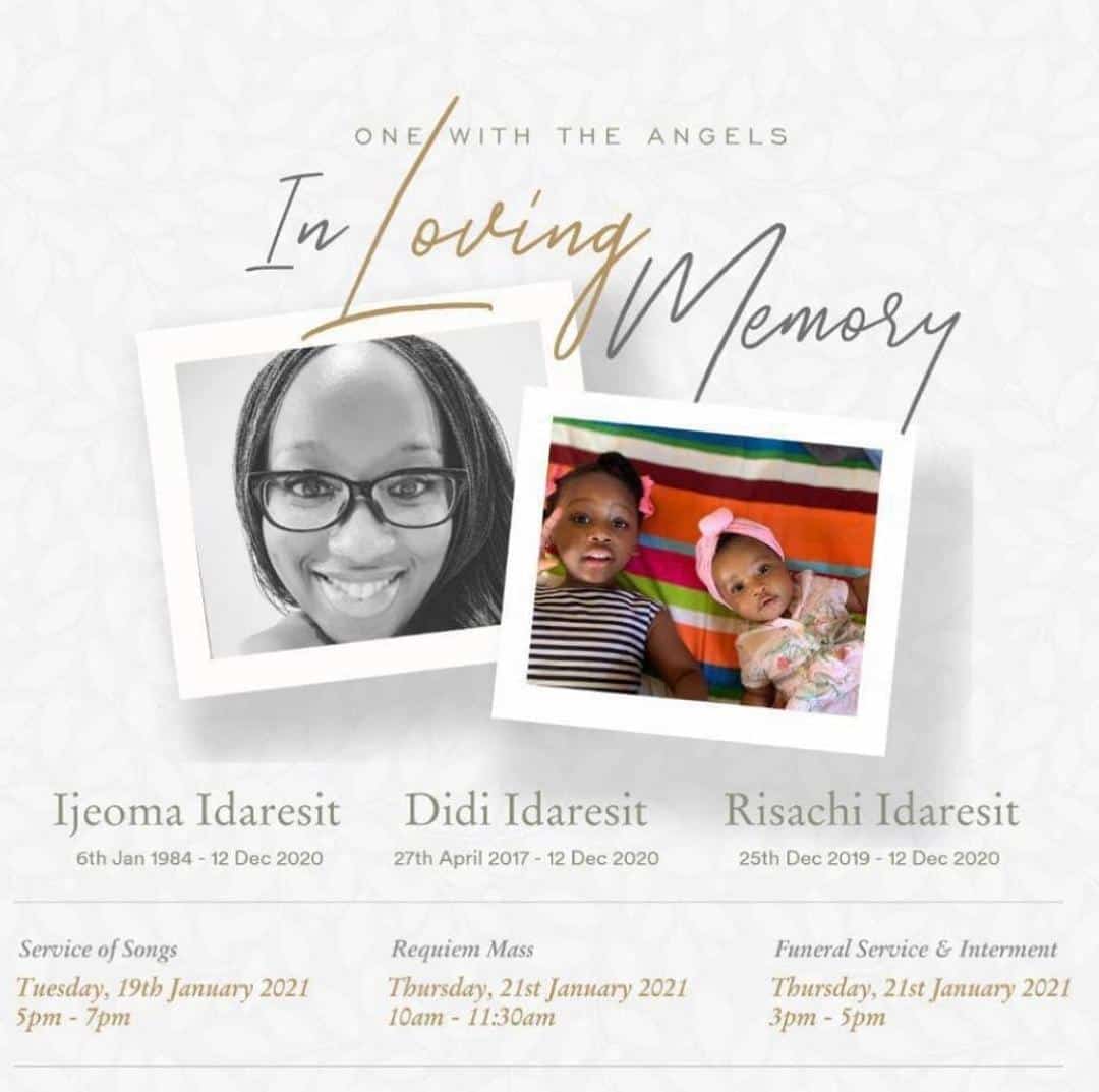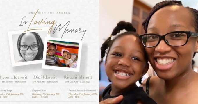The mother, Ijeoma Idaresit and her two children identified as Didi and Risachi have been laid to rest yesterday, Thursday, January 21, 2021.