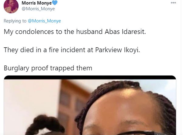 According to the Twitter user, @ Morris Monye who shared the sad story on the micro-blogging platform, the wife and her two kids lost their lives after they were trapped by a burglary proof in the fire.