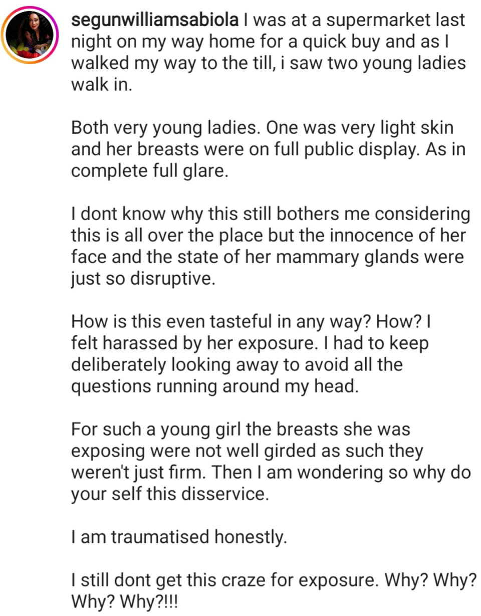 “I was at a supermarket last night on my way home for a quick buy and as I walked my way to the till, i saw two young ladies walk in. Both very young ladies. One was very light skin and her breasts were on full public display. As in complete full glare.