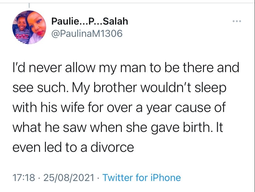 “I’d never allow my man to be there and see such. My brother wouldn’t sleep with his wife for over a year cause of what he saw when she gave birth. It even led to a divorce