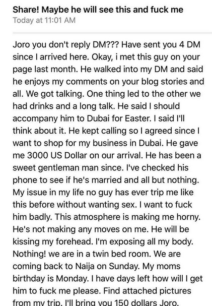 Joro Olumofin has shared a story of a young lady who is dying to have intimacy with her “loaded” new lover.