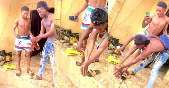 In the video, one young man is seen popping a bottle of wine before proceeding to use it to wash the feet of another guy beside him – he uses the whole content of the bottle to wash both feet and this action of his has sparked reactions online.