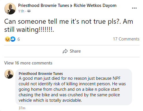 During the chase, Richard reportedly fell from the motorcycle and the police van coming behind him at top speed, crushed him along the Ogolonto BRT lane.