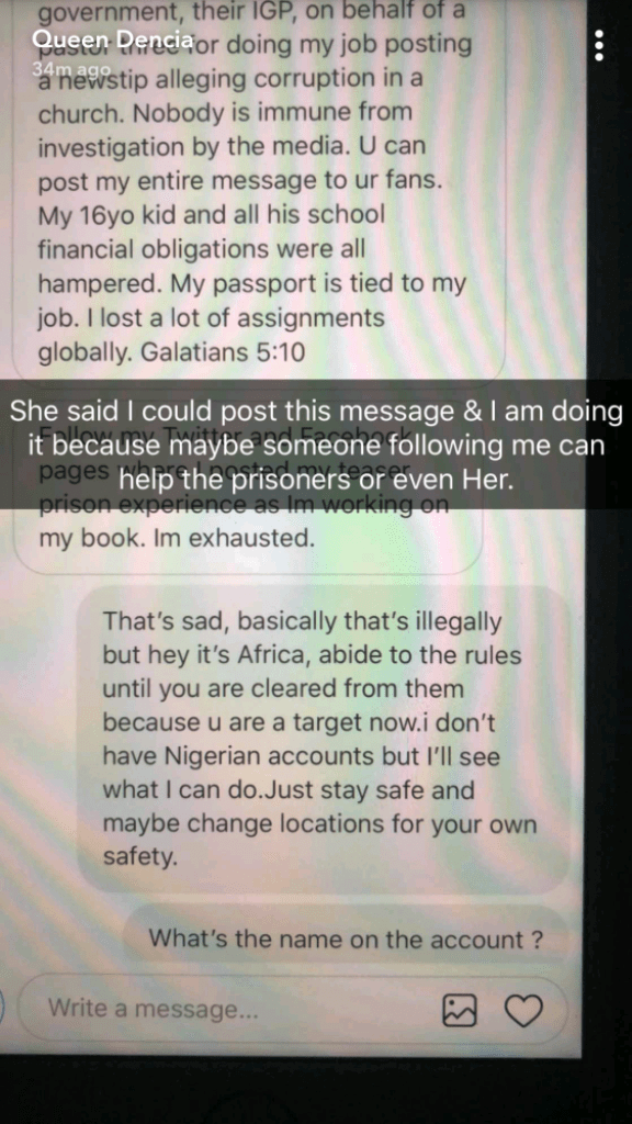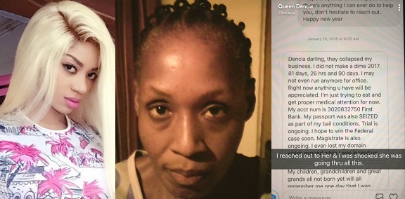 Controversial Nigerian journalist, Kemi Omololo Olunloyo who regained freedom after spending 90 days in Port-Harcourt Maximum Prison has cried out to Cameroonian singer and cosmetic entrepreneur, Dencia.