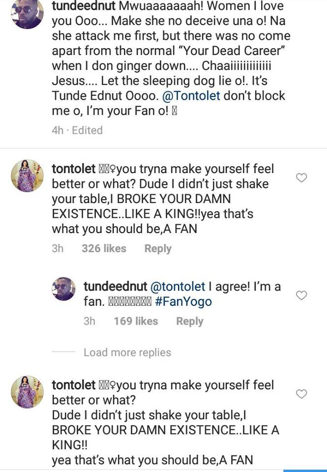He also wrote; “Mwuaaaaaaah! Women I love you Ooo… Make she no deceive una o! Na she attack me first, but there was no come apart from the normal “Your Dead Career” when I don ginger down…. Chaaiiiiiiiiiiiii Jesus…. Let the sleeping dog lie o!. It’s Tunde Ednut Oooo. @Tontolet don’t block me o, I’m your Fan o!”