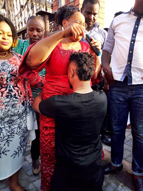 Ofoedu who presented the car gift to his mother during his house opening ceremony, on Saturday, in Enugu State, is seen in photos shared online, kneeling down holding tightly to his mum as she said a prayer for him.