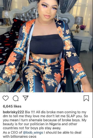 Bia!!! All dis broke men coming to my dm to tell me they love me don’t let me SLAP you. So you mean I turn shemale because of broke boys. My beauty is for our politician in Nigeria and other countries not for boys pls stay away. As a CEO I should be able to deal with billionaires ceos.
