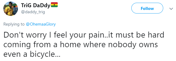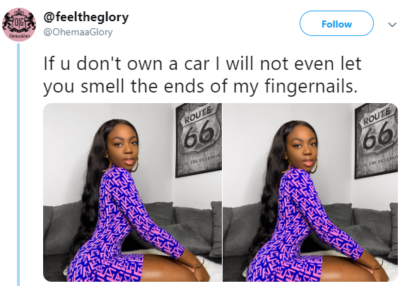 @OhemaaGlory had people displeased after she took to her page to share a photo of herself and say any guy who doesn’t have a car, should not come near her.
