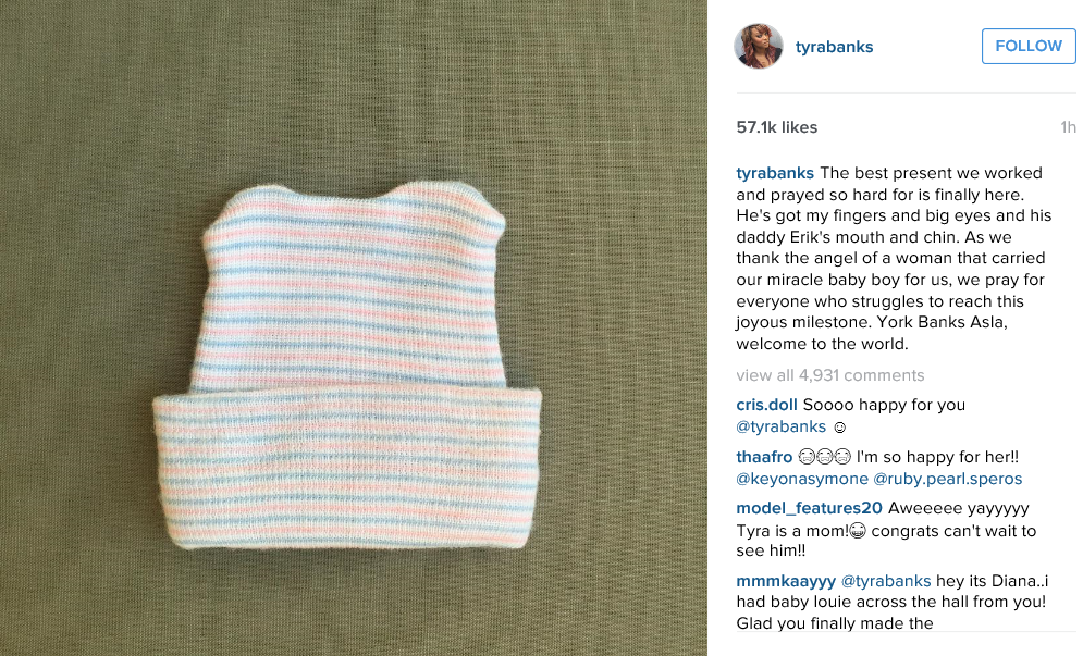 Her son’s name is York Banks Asla, via a surrogate. She posted the announcement on her Instagram page. She put a photo of baby’s hat and wrote: